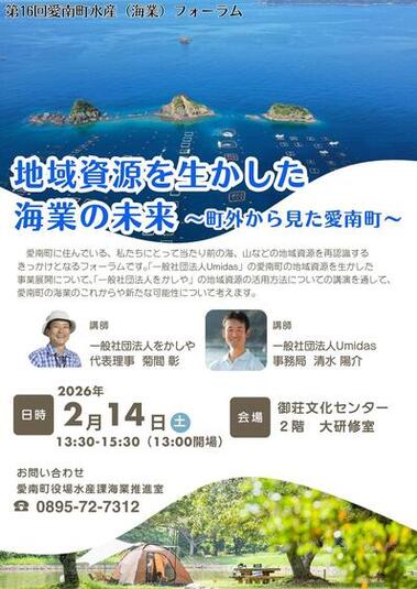 愛南町では水産業の振興および海業の推進を図るため毎年1回、各種テーマを掲げ水産(海業)フォーラムを開催しています。令和7年度は、「地域資源を生かした海業の未来~町外から見た愛南町~」をテーマ に、地域資源の活用方法や愛南町の新たな可能性について講演を行っていただきます。