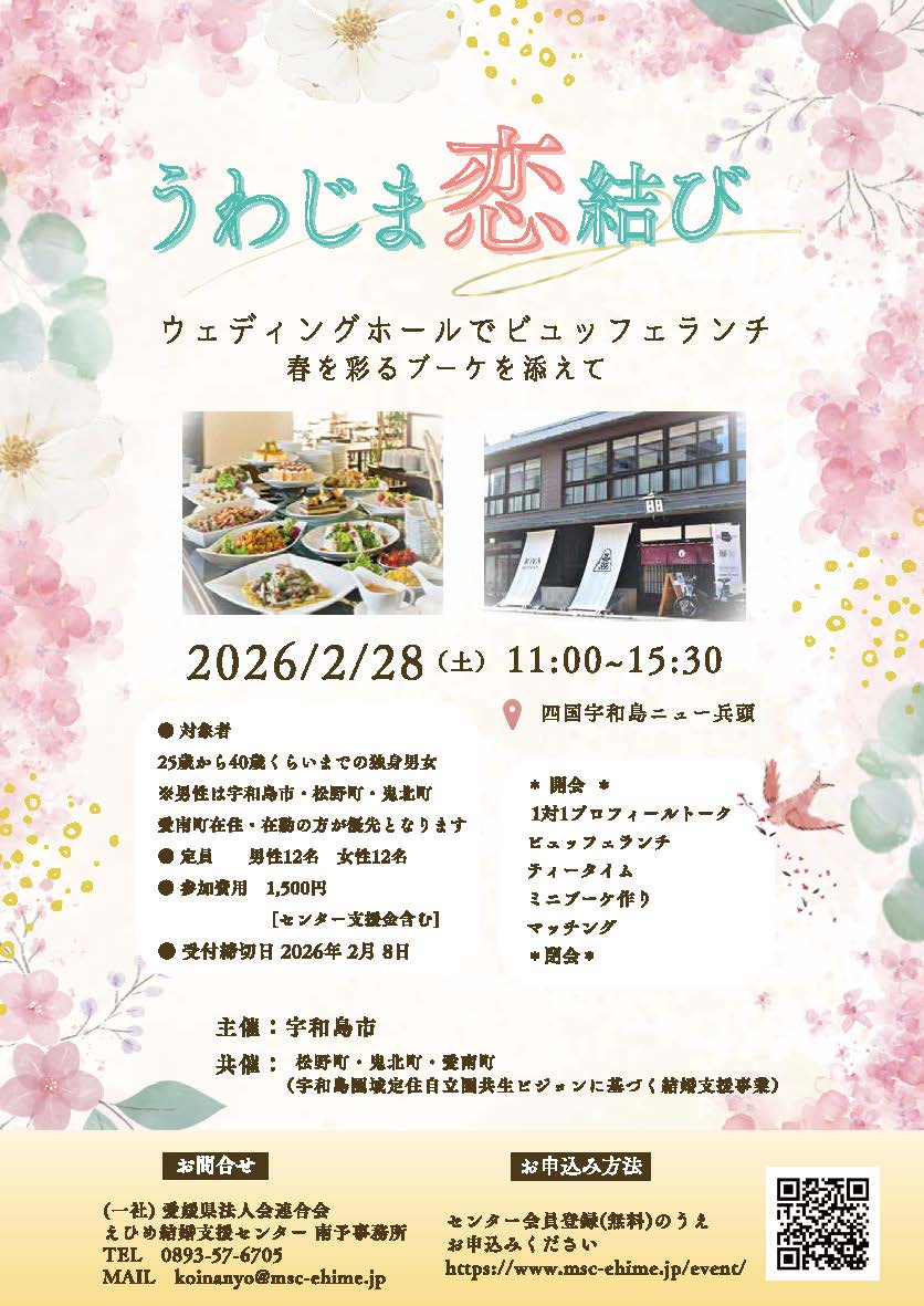宇和島圏域の市町(宇和島市・松野町・鬼北町・愛南町)で締結する、宇和島圏域定住自立圏共生ビジョンに基づく事業として、出会いの場を提供するイベントを開催します。素敵な出会いを探してみませんか?