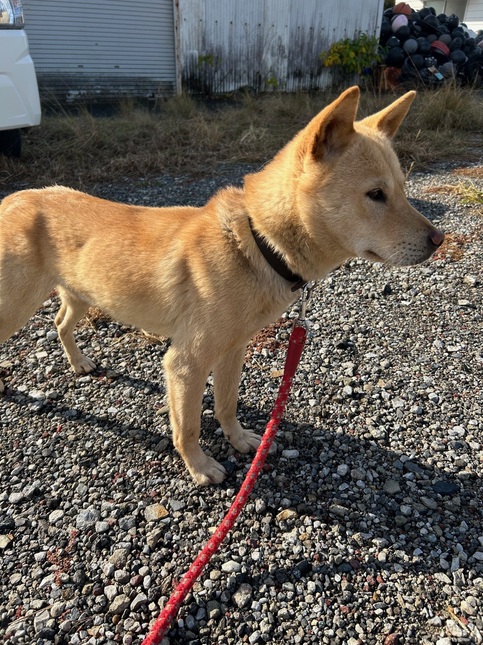 薄茶の中型犬・雄(首輪・リードは役場の物)